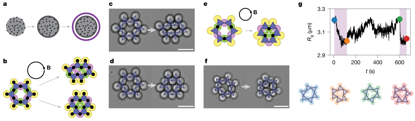 图4 | 通过磁驱动实现可控变形。 a. 为了制造磁响应的胶体kagome结构,含有超顺磁氧化铁纳米颗粒的胶体球被包覆二氧化硅,并用脂质和DNA连接子功能化。b-d. 在快速旋转的磁场(10 Hz)中,磁性胶体球相互吸引,从而以两种方式之一压缩kagome环,如明场显微镜实验观察所示(c, d)。e, f. 当只有三个粒子具有磁响应(用绿色标示)时,它们会纯粹沿拉胀模式压缩,如示意图(e)和实验实现(f)所示。g. 当磁场开启时(紫色阴影),随着结构沿模式折叠,回旋半径 Rg减小。当磁场关闭时,热涨落使结构再次展开。下方展示了所示时间点的构象。比例尺,5 μm。