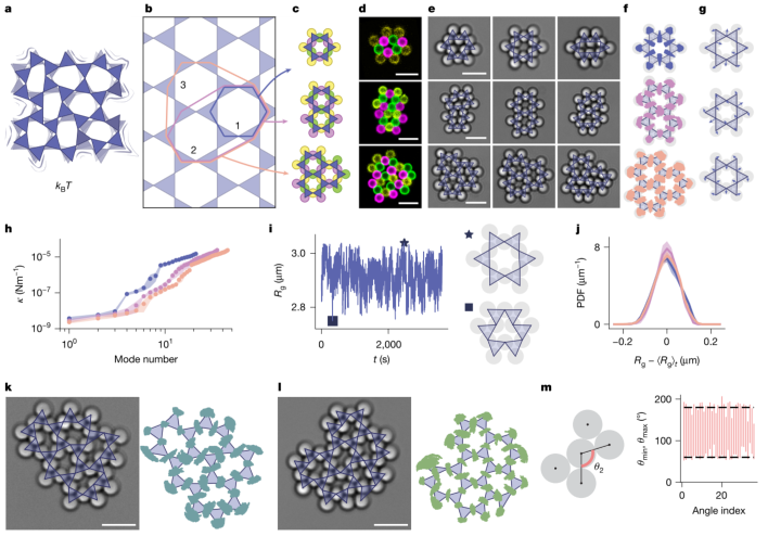 图3 | 热驱动的旋转三角形结构。 a. 柔性kagome晶格的示意图。b, c. 选择kagome晶格的子集转化到胶体铰链系统,如c中示意。d, e. 共聚焦显微镜图像显示实验实现(d;不同粒子功能化由颜色和荧光染料标示)和明场显微镜快照显示热涨落带来的结构柔性(e)。f. 用于模式分析的、减去整体平移和旋转后的粒子位置。g. 最小结构的最软的三个模式。h. 模式谱。i. 最小结构的回旋半径Rg时间序列,标出了Rg最大和最小处的构象。j. 来自i的回旋半径 Rg(t)相对于其时间平均值 ⟨Rg(t)⟩的直方图。k, l. 具有五个(k)和六个(l)环的kagome结构的明场显微镜快照和粒子轨迹。m. 六环kagome结构的观测开合角范围。h和j中的阴影区域代表标准差。比例尺,5 μm。