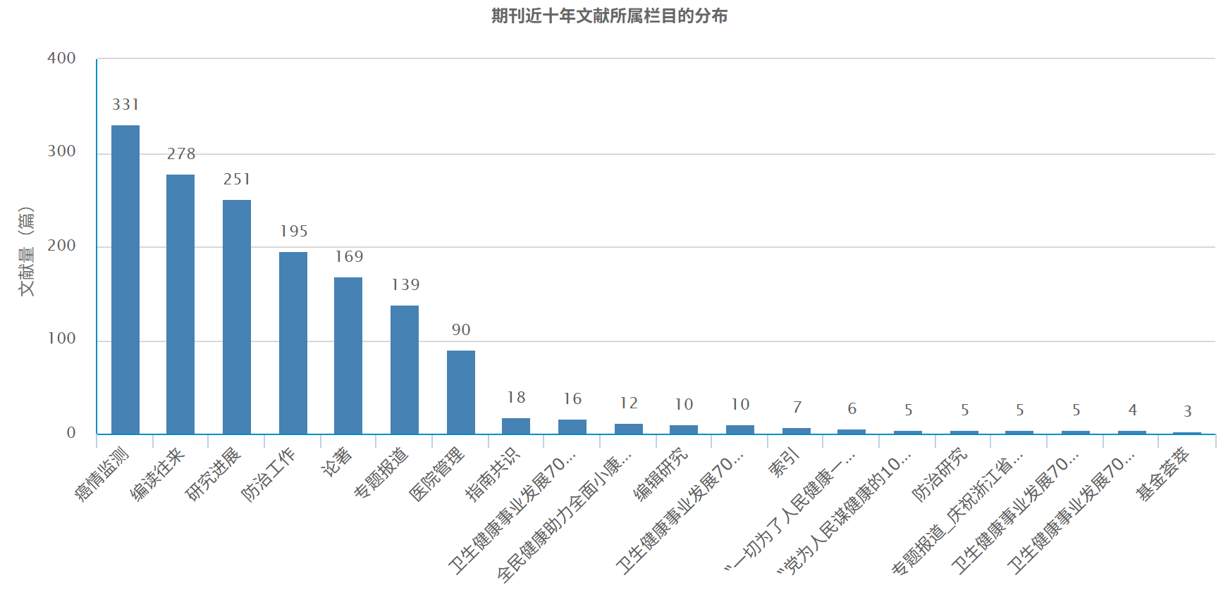从文献所属栏目来看,该期刊的发文类型以癌情监测、编读往来、研究进展、防治工作、论著等为主。