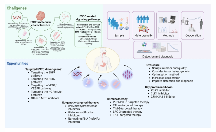 指出领域挑战:ESCC 多组学研究存在样本匮乏、肿瘤异质性大、分析流程不标准、多中心验证不足等问题。