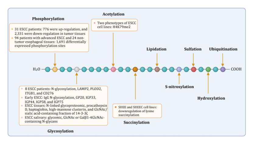 蛋白翻译后修饰分析:总结出磷酸化、糖基化、乙酰化是 ESCC 的关键蛋白调控方式,为后续靶点挖掘提供了全新方向(图 4)。