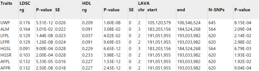 局部遗传相关(LAVA):再聚焦 “具体基因组区域”—— 用 LAVA 分析 88 个半独立基因组区域,最终筛选出 17 个显著双变量区域(FDR<0.05)。比如 chr3q27.1 区域(含 KLHL24、MAP6D1 基因)是 PBC 与 ALM 关联最强的区域,chr2q32.2-q32.3 区域(含 STAT 家族基因)同时关联 PBC 与少肌症的 5 个表型(LFPL、LFPR 等)(表 1);