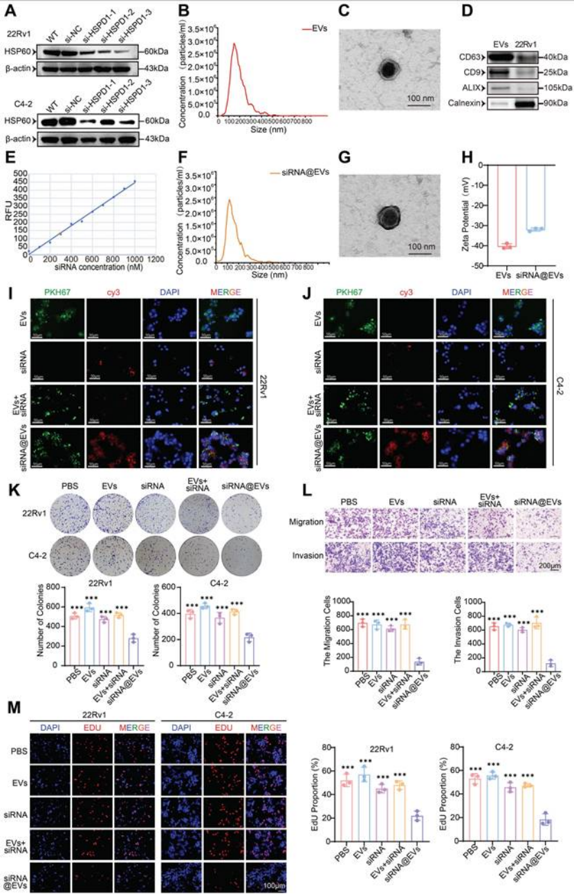 细胞摄取:PKH67 标记的 EVs 能被前列腺癌细胞高效摄取,将 siRNA 成功递送至上清液(图 6I-J);