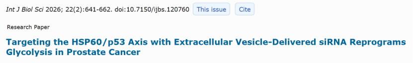 前列腺癌(PCa)是男性高发的泌尿系统恶性肿瘤,进展至去势抵抗性前列腺癌(CRPC)后治疗选择有限,预后极差。代谢重编程(尤其是 Warburg 效应)是肿瘤恶性进展的核心特征,而热休克蛋白 60(HSP60)在前列腺癌中的作用及调控机制尚未明确。近日,华中科技大学同济医学院附属同济医院团队在《International Journal of Biological Sciences》(Int J Biol Sci,IF=10,2026 年发表,开源获取)发表重磅研究:通过多数据库筛选 + 临床样本验证,证实 HSP60 在前列腺癌中特异性高表达,且通过抑制 p53 活性促进糖酵解重编程,驱动肿瘤增殖转移;进一步构建 siRNA 负载的细胞外囊泡(siRNA@EVs)靶向沉默 HSPD1(编码 HSP60),在体内外均能有效抑制前列腺癌进展,且安全性良好。