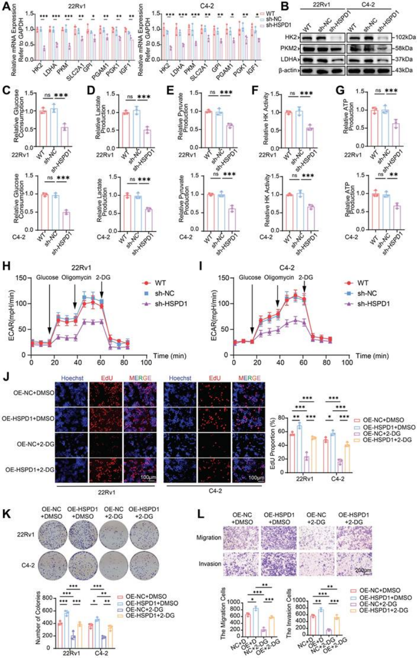 功能验证:HSPD1 敲低后,前列腺癌细胞的葡萄糖消耗、乳酸 / 丙酮酸生成、己糖激酶(HK)活性、ATP 产量均显著降低(图 4C-G),糖酵解关键酶(HK2、PKM2、LDHA)表达下调(图 4B);