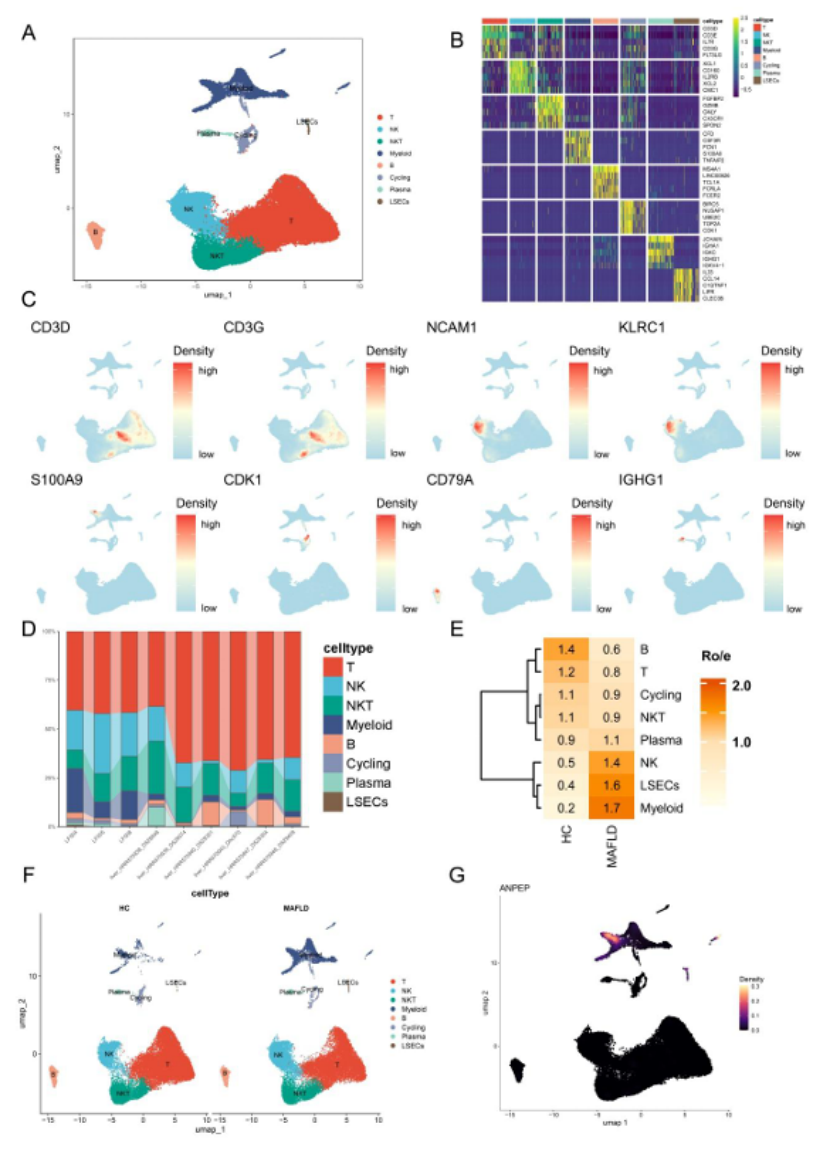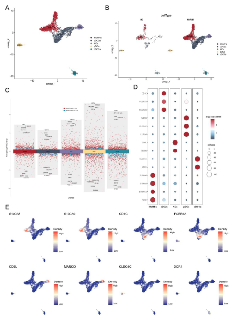 功能富集:ANPEP 高表达的 MoMFs 富集氧化应激、趋化因子信号、脂质代谢紊乱通路;cDC1s 富集 NF-κB、铁死亡、纤维化相关通路,直接关联 MAFLD 核心病理过程(图10I-J);