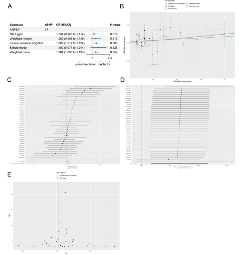 遗传因果验证:孟德尔随机化分析显示,ANPEP 水平升高与 MAFLD 风险增加显著相关(OR=1.069,95% CI:1.017-1.124,P=0.008),排除反向因果(图6A)。