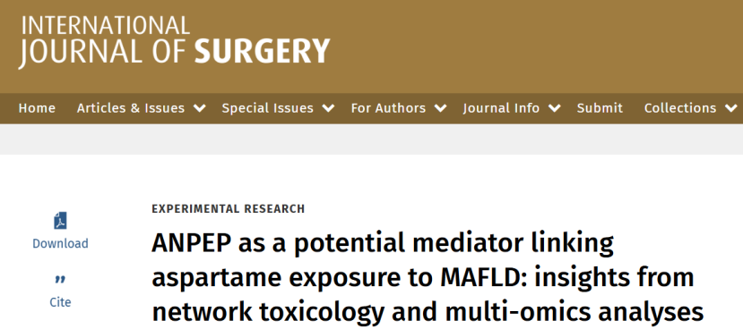 阿斯巴甜(APM)作为全球最常用的人工甜味剂,凭借 “零热量” 被奉为减肥、控糖的 “健康选择”。但近年来,其潜在健康风险引发争议。近日,Xu Long、Zhang Chi 团队在《International Journal of Surgery》(外科顶刊)发表重磅研究:通过网络毒理学、多组学及孟德尔随机化等多维度验证,首次证实阿斯巴甜暴露与代谢相关脂肪性肝病(MAFLD)存在因果关联,核心机制是阿斯巴甜靶向结合 ANPEP(CD13),激活肝内髓系细胞炎症与脂质紊乱,且 ANPEP 在脂肪肝早期纤维化阶段即显著上调!
