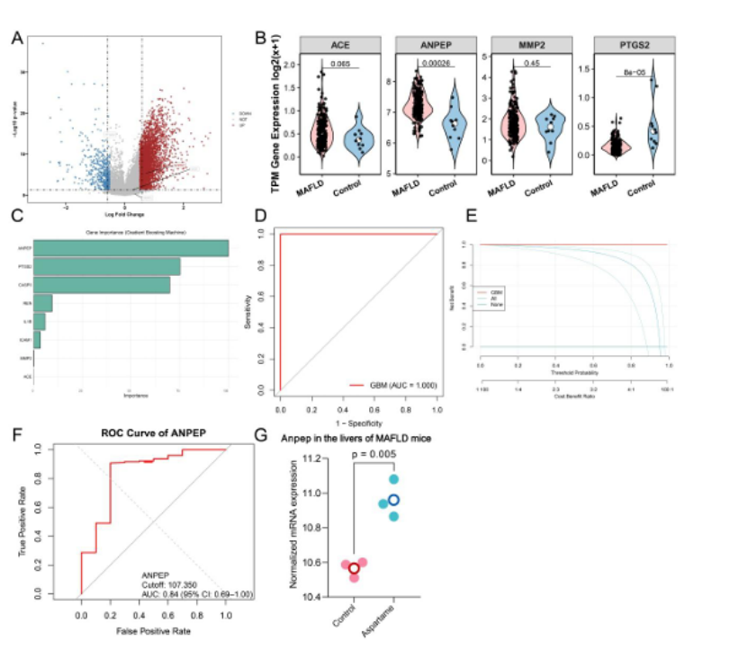 动物模型验证:阿斯巴甜喂养小鼠肝组织中 Anpep 显著上调(P=0.005),且加剧肝脂肪变性(图5G);