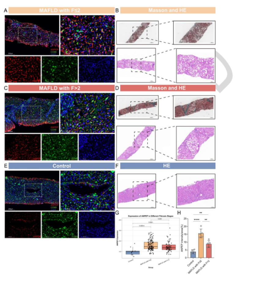 定位验证:肝组织免疫荧光显示,ANPEP 与 CD68⁺髓系细胞共定位,MAFLD 患者(无论早期 / 晚期纤维化)ANPEP 表达均显著高于对照组(图8A、C、E);