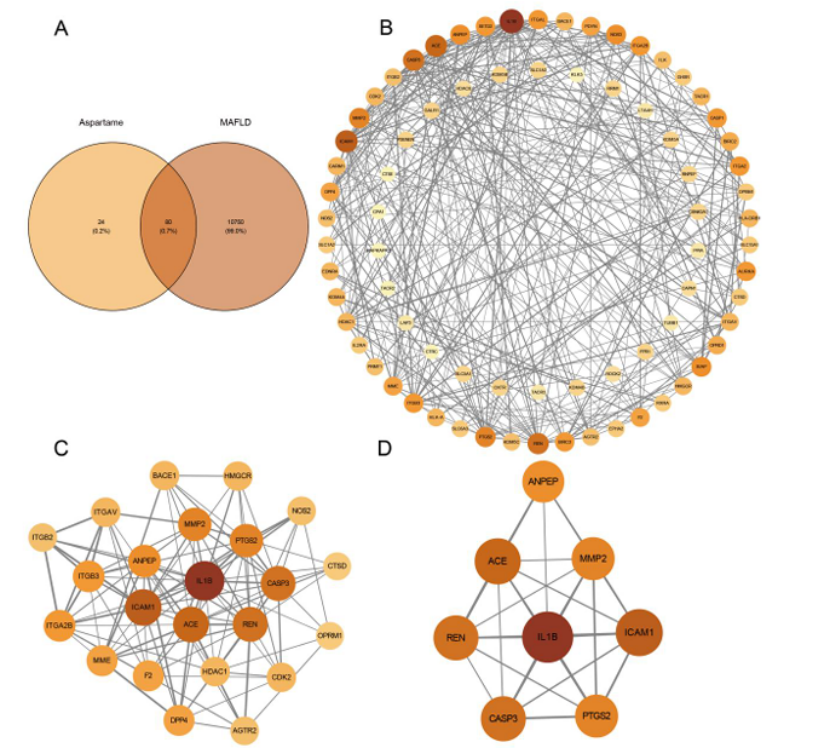 靶点筛选:SwissTargetPrediction 预测 104 个阿斯巴甜靶点,与 GeneCards 数据库 10830 个 MAFLD 相关基因交集,得到 80 个共同靶点(图1A);