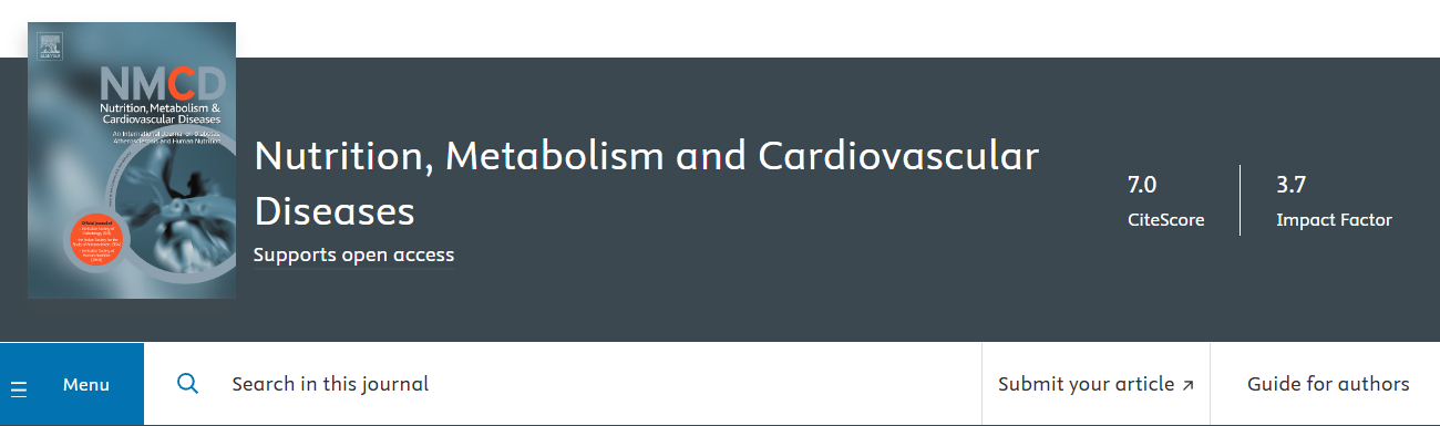 期刊官网:http://www.journals.elsevier.com/nutrition-metabolism-and-cardiovascular-diseases/ NUTRITION METABOLISM AND CARDIOVASCULAR DISEASES