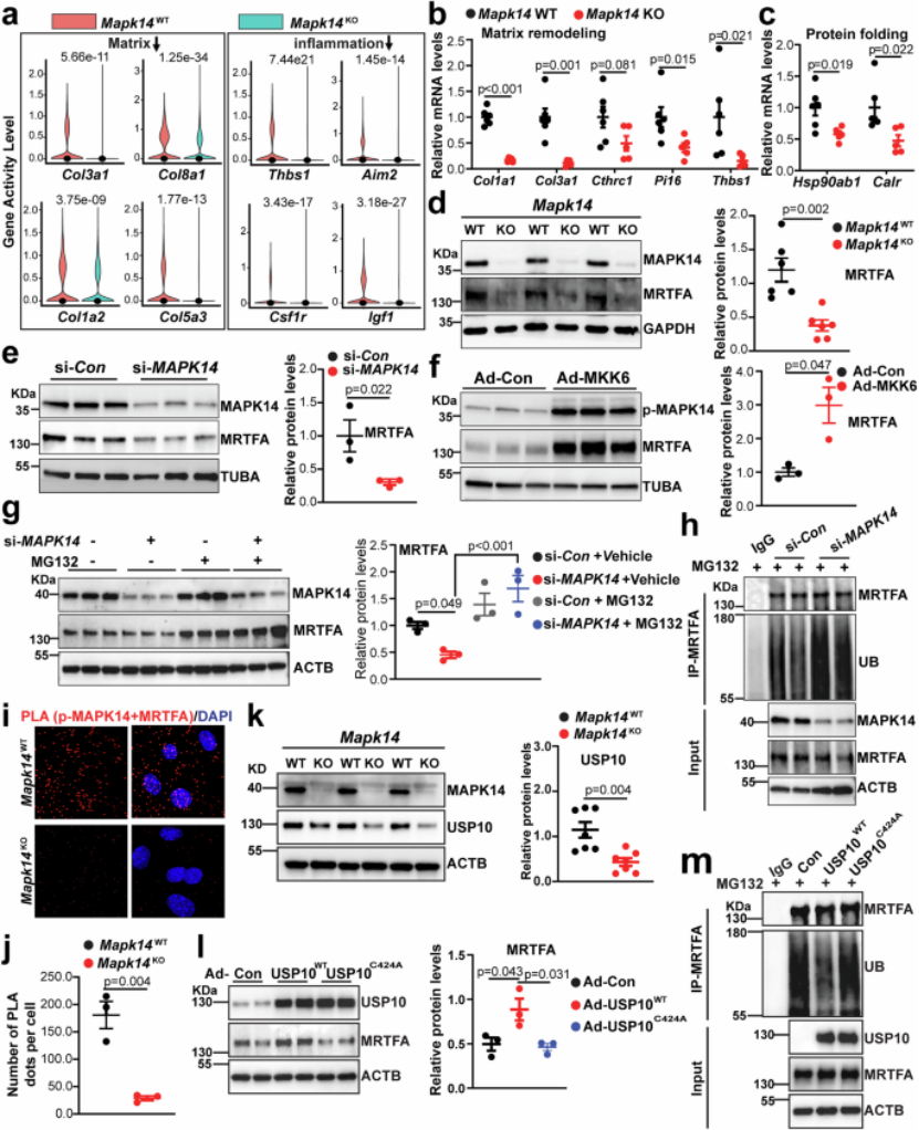 MAPK14 与 MRTFA 物理互作(PLA 验证,图 7i-j),通过上调去泛素酶 USP10 稳定 MRTFA(图 7k-m);