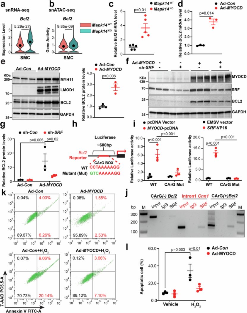 MYOCD/SRF 通过 Bcl2 启动子的 CArG 盒激活其转录(图 6h-j);