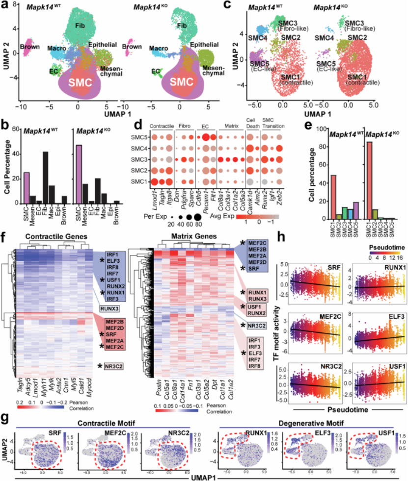 VSMC 分群为 “收缩型 SMC1、内皮样 SMC2、纤维化 SMC3”,KO 组 SMC1 占比从 41% 升至 75%,退化型 SMC2/3 占比下降(图 2f);