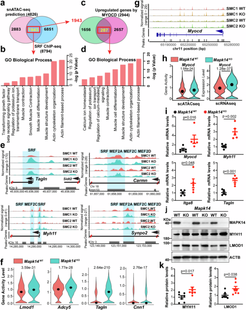 KO 组 Myocd 基因区域染色质可及性升高,收缩标志物(MYH11、LMOD1)的 mRNA / 蛋白水平上调(图 5g-k);