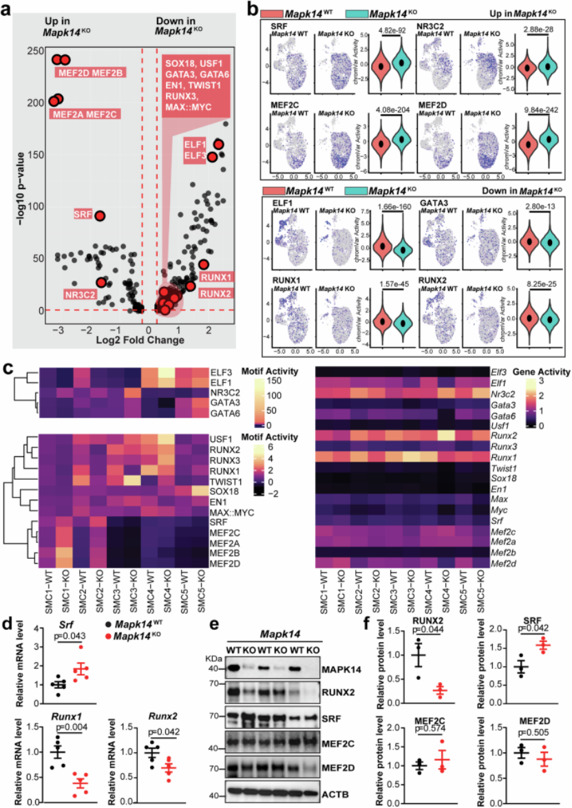 KO 组收缩型 TF(SRF、MEF2C)的 motif 活性升高,退化型 TF(RUNX2、ELF1)活性降低(图 3f-g);