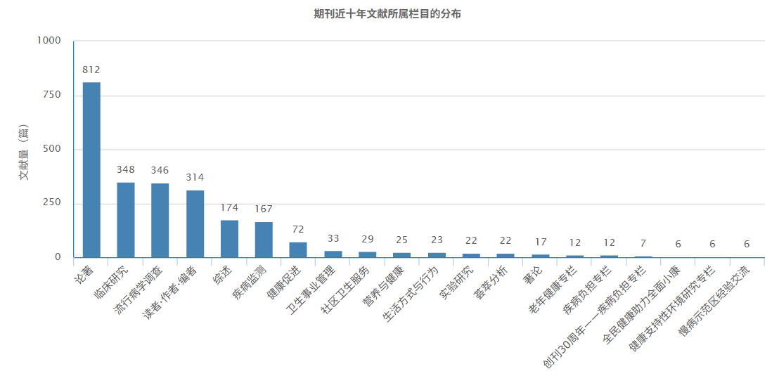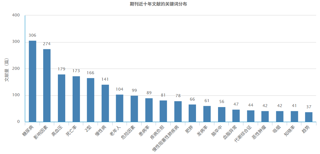 在该期刊中,"糖尿病"栏目的发文量最高,其次是"影响因素"、"高血压"、"死亡率"等。