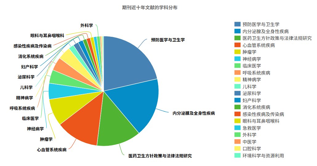 从学科分布情况来看,该期刊以“预防医学与卫生学"为主要收录学科,占比在21.4%,分布第二的收录学科为"内分泌腺及全身性疾病",占比在17.5%,其次是"医药卫生方针政策与法律法规研究"、"心血管系统疾病"等学科。