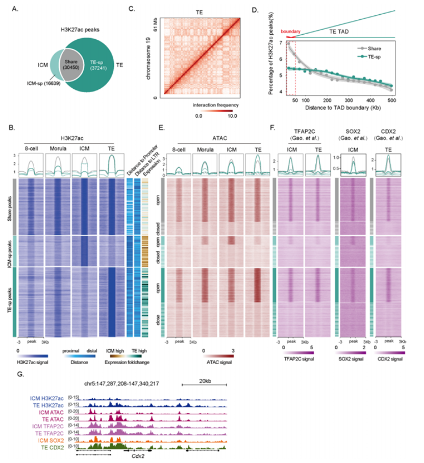 核心发现:H3K27ac 在 ICM 和 TE 中分布存在显著差异,TE 的 H3K27ac 峰数量显著高于 ICM(图 1F),且大量 H3K27ac 峰富集在基因远端区域(图 1H),提示远端顺式调控元件在谱系分化中的作用;
