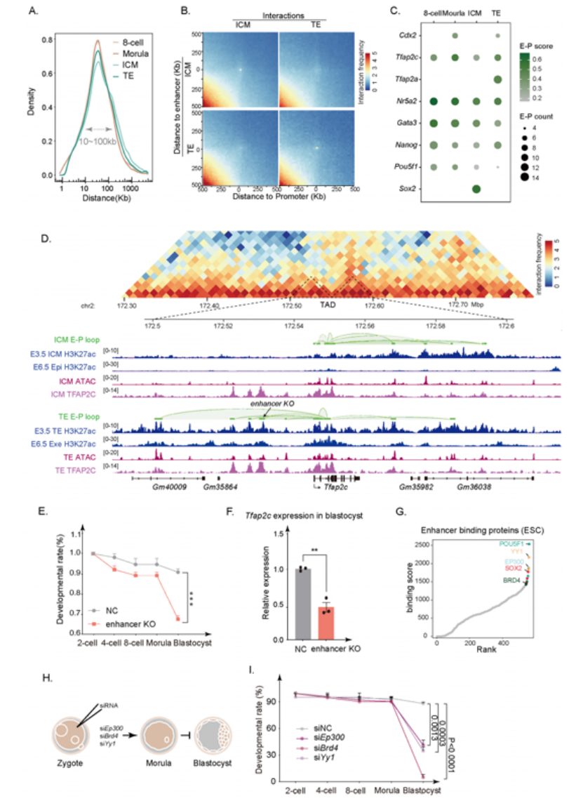 核心调控因子鉴定:通过 GIGGLE 分析筛选出结合增强子的关键因子 p300(H3K27ac 写入器)、BRD4(增强子阅读器)、YY1(E-P 环组织者),敲低这些因子后胚胎均发生发育阻滞(图 4G-I),证实其为谱系分化的核心调控因子。