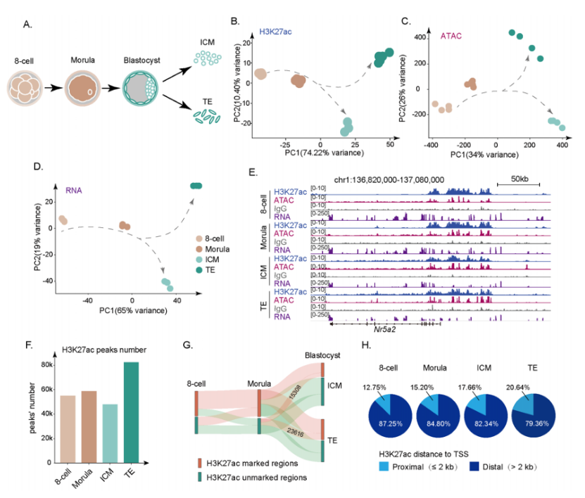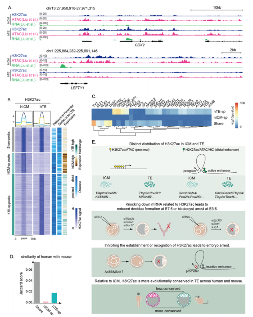 关键词:早期胚胎、谱系分化、H3K27ac、远端增强子、染色质相互作用、多组学、表观遗传调控、滋养外胚层、内细胞团