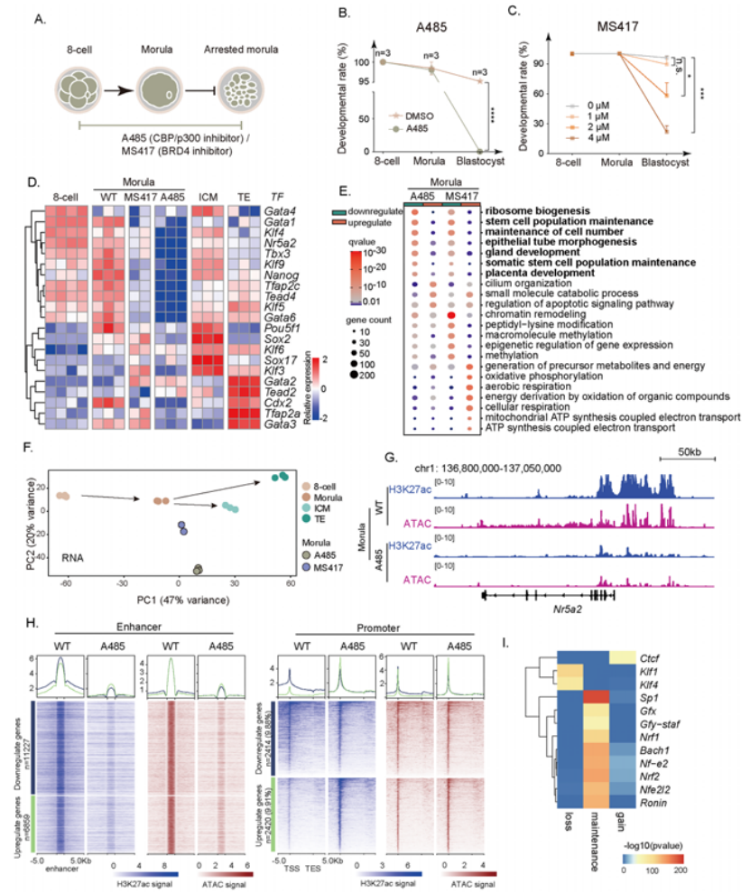 抑制剂处理:用 A485(CBP/p300 抑制剂)和 MS417(BRD4 抑制剂)处理 8 细胞胚胎,均导致胚胎在桑椹胚阶段完全阻滞(图 5B-C);