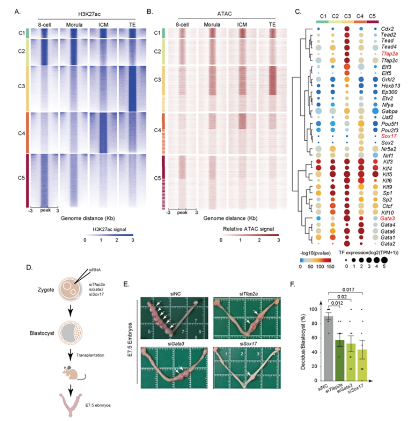 功能初验证:敲低 Tfap2a、Gata3、Sox17 后,胚胎虽可正常形成囊胚,但植入效率显著降低(图 2D-F),证实这些转录因子在胚胎后期发育中的关键作用。