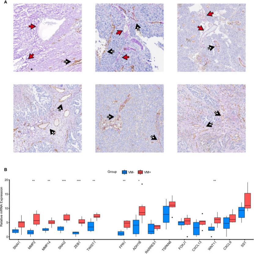 用 IHC-PAS 染色找 VM 结构(CD31⁻/PAS⁺,图 6A),6 例阳性(符合文献报道比例);