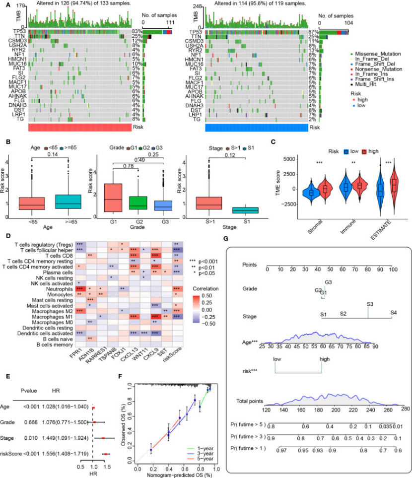建“nomogram”:把 9 基因模型和年龄、分期、分级整合,能定量预测 1/3/5 年生存(图 5G),校准曲线证明预测准(图 4F)—— 这东西对临床医生太实用了,期刊就爱这种 “能直接用的工具”;