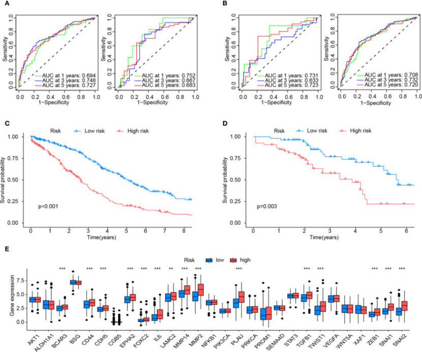 关键是“稳”:训练集 1/3/5 年 AUC 0.694/0.746/0.727,外部验证集也有 0.731/0.633/0.723(图 4A-B),高低危组生存期差异在所有数据集都显著(图 3C-D)—— 医生建模型一定要做 “多数据集验证”,不然审稿人会说 “过拟合”。