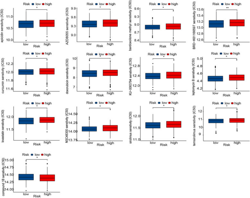 关联免疫 + 药敏:VM-high 组免疫评分、 stromal 评分更高(图 4C),还能预测药物敏感性(比如高风险组对多柔比星耐药,对 Compound 1B 敏感,图 5)—— 这步把 “预后模型” 和 “治疗选择” 挂钩,文章价值直接翻倍