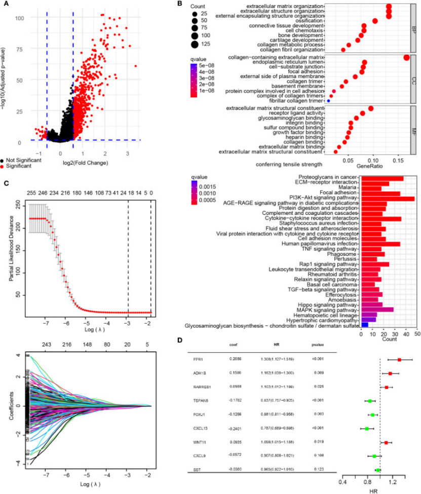 再用单因素 Cox 从 DEGs 里挑出 260 个预后相关基因,LASSO 回归压缩到 9 个核心基因(FPR1、ADH1B 等,图 2C-D),建了 “VM 相关预后指数(VMRPI)”;