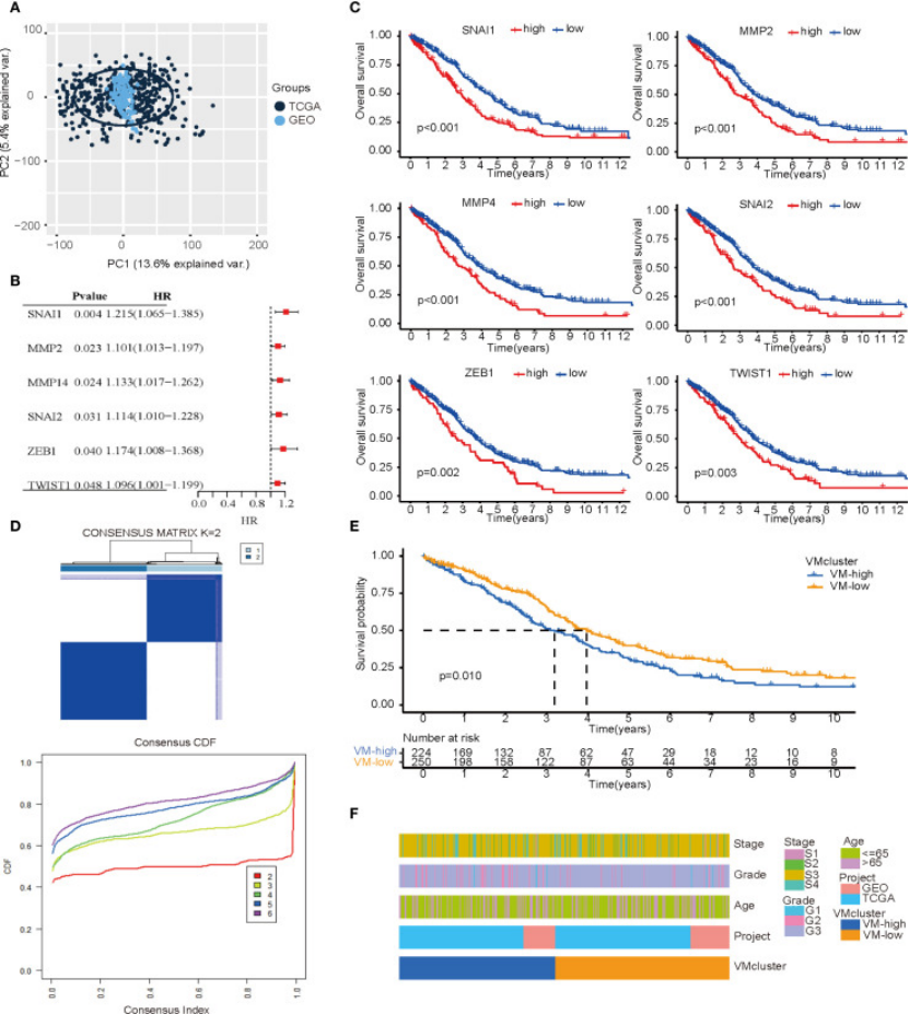 VM 是卵巢癌预后差的关键,但之前没人用它分亚型。作者先从文献挖了 28 个 VM 相关基因,再用单因素 Cox 筛选出 6 个有预后意义的核心基因(SNAI1、MMP2 等,图 1B),最后用共识聚类把 474 例患者分成 “VM-high” 和 “VM-low” 两组(图 1D):