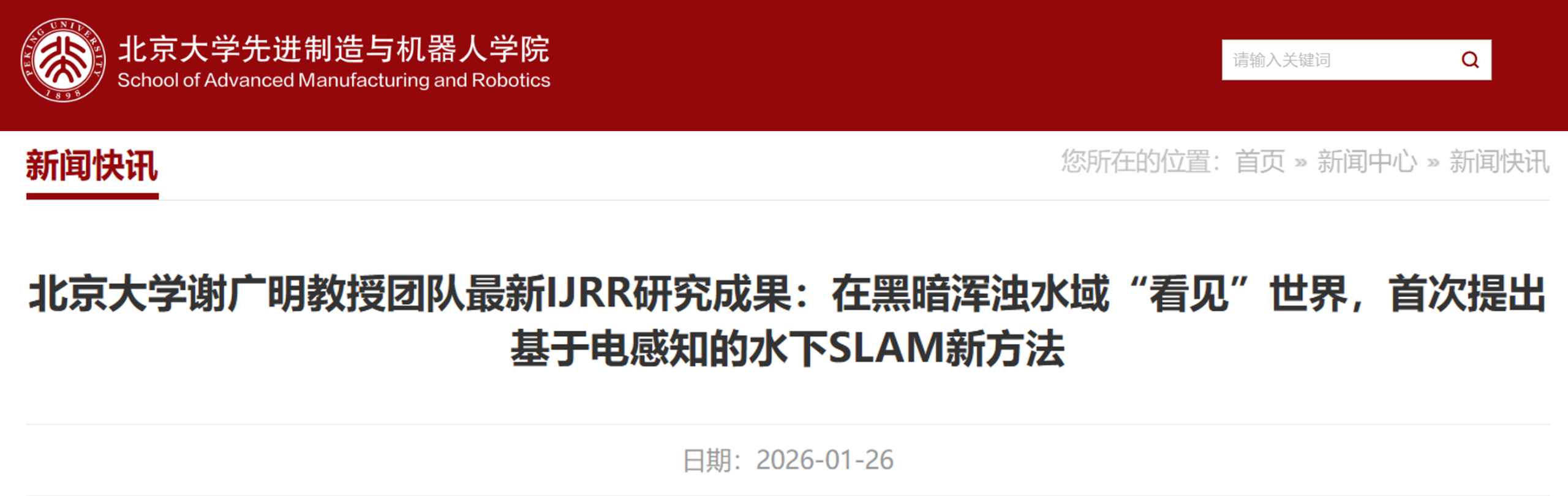该论文是北京大学作为第一完成单位在IJRR发表的首篇研究论文,标志着学校在水下机器人与新型感知SLAM研究方向取得重要突破。