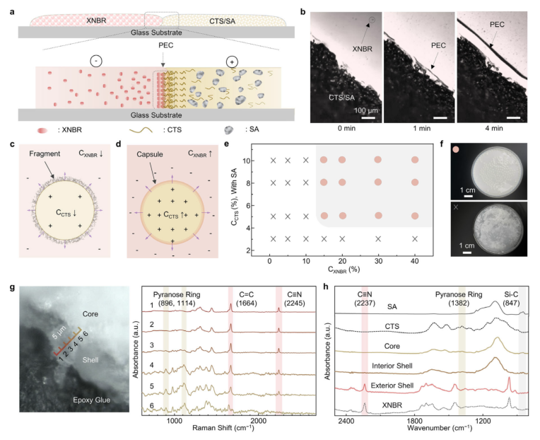 图2 | SAACs的自组装机制 (a) XNBR与CTS/SA界面处PEC形成的示意图。 (b) XNBR与CTS/SA界面在0、1和4分钟时的光学显微镜图像,显示PEC层形成。 (c,d) PEC壳层碎片(c)和胶囊(d)形成的示意图。 (e) XNBR-CTS/SA体系中电解质浓度与碎片和胶囊形成关系的示意图。 (f) 组装过程中胶囊和碎片形成的代表性照片。 (g) SAACs壳层的拉曼线扫描,从外部到内部对应点1至6。 (h) SAACs三个部分(核心、壳层内部、壳层外部)、SA、CTS和XNBR的ATR-FTIR光谱。