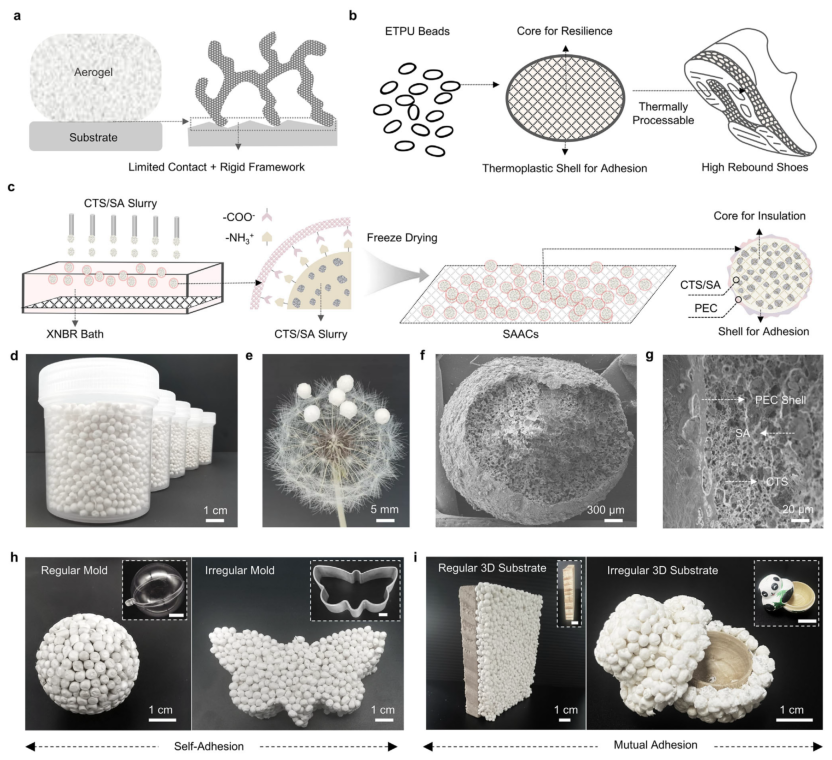 图1 | SAACs的设计与制备 (a) 传统气凝胶与基材接触示意图,显示有限的界面接触。 (b) 受ETPU启发的示意图,突出其可热加工的核壳结构。 (c) SAACs的制备过程,结合静电自组装和冷冻干燥方法。 (d) 制备的SAACs光学图像,展示规模化生产的潜力。 (e) SAACs立于蒲公英种子上的照片。 (f,g) 单个SAACs横截面的SEM图像(f)和放大图像(g),突出核壳结构。 (h,i) 在规则和不规则模具中形成的自粘附SAACs照片(h),以及粘附在规则和不规则基材上的SAACs照片(i)。
