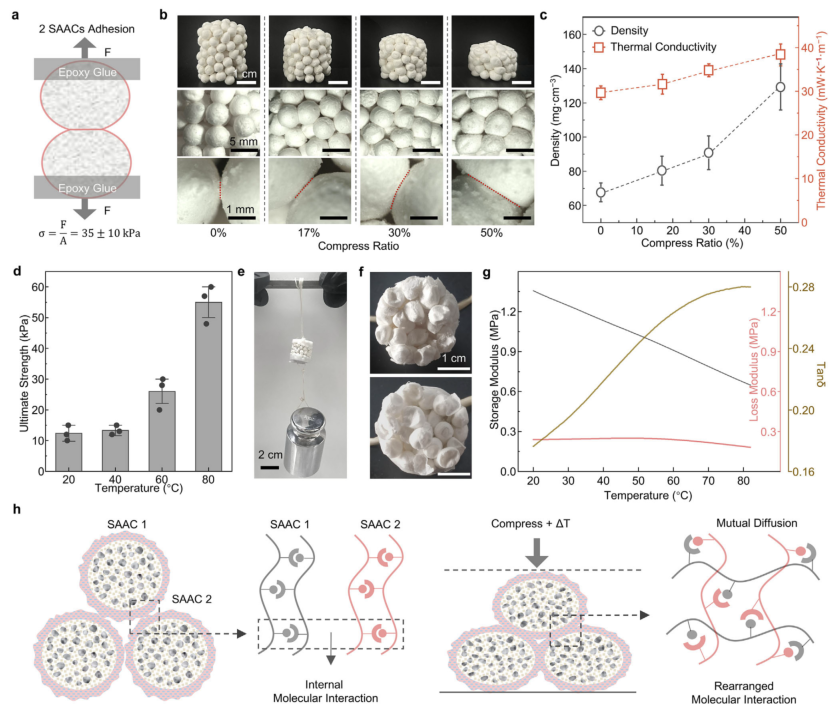 图4 | SAACs的自粘附性能 (a) 两个粘附SAACs的拉伸测试示意图。 (b) 不同压缩比下粘附的SAACs圆柱体。 (c) SAACs圆柱体的密度和热导率。 (d) 不同温度下粘附的圆柱体的极限拉伸强度。 (e) SAACs圆柱体悬挂200 g校准砝码的照片。 (f) 拉伸测试后圆柱体的断裂形貌。 (g) XNBR的DMA曲线。 (h) 自粘附机理示意图。