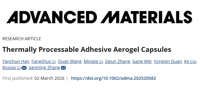 气凝胶以其超低密度和卓越隔热性能而闻名于世,然而传统气凝胶由于多孔表面和刚性骨架导致的弱粘附性,一直是制约其集成到功能系统中的重大挑战。近日,青岛科技大学张建明教授、李柏霄博士团队受膨胀热塑性聚氨酯微珠核壳结构的启发,成功开发出一种自组装粘附性气凝胶胶囊。这种创新材料通过仿生结构设计,将多孔壳聚糖/二氧化硅气凝胶核与粘附性壳聚糖/羧基丁腈橡胶壳有机结合,既保留了气凝胶的优异隔热性能,又赋予了材料热激活粘附能力。这种新型自组装粘附性气凝胶胶囊通过静电自组装和冷冻干燥技术制备而成,带负电的XNBR成功包覆带正电的CTS/SA骨架,形成独特的核壳结构。SAACs可在80°C以下的温和温度下进行热加工,自粘形成三维组装体,适应不规则形状,并能粘附于多种基材表面。尽管具有粘附能力,SAACs仍保持低密度(57-96 mg·cm⁻³)、低热导率(30-39 mW·m⁻¹·K⁻¹)和固有的阻燃性能,突破了传统气凝胶或ETPU的性能局限。相关论文以“Thermally Processable Adhesive Aerogel Capsules”为题,发表在Advanced Materials上。