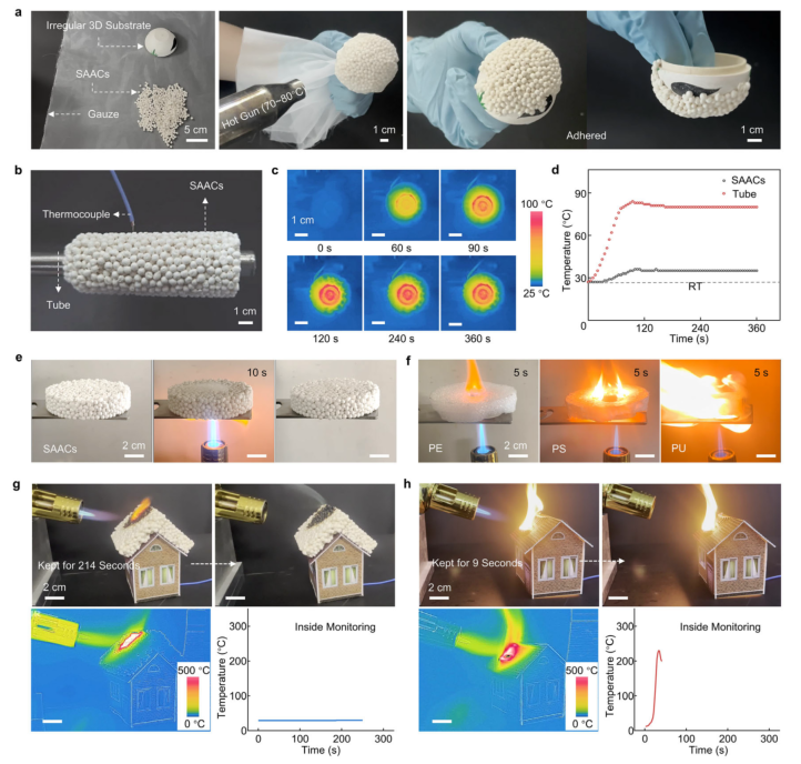 图6 | SAACs的实际应用 (a) 使用热风枪将SAACs现场加工粘附于不规则三维基材的照片。 (b,c) SAACs用于管道隔热的照片(b)和红外图像(c)。 (d) 热电偶监测的管道表面和SAACs表面温度随时间变化。 (e,f) SAACs(e)、PE、PS和PU泡沫(f)的水平燃烧测试。 (g,h) 有(g)和无(h)SAACs保护的房屋模型在丁烷火焰下的防火演示照片和红外图像。