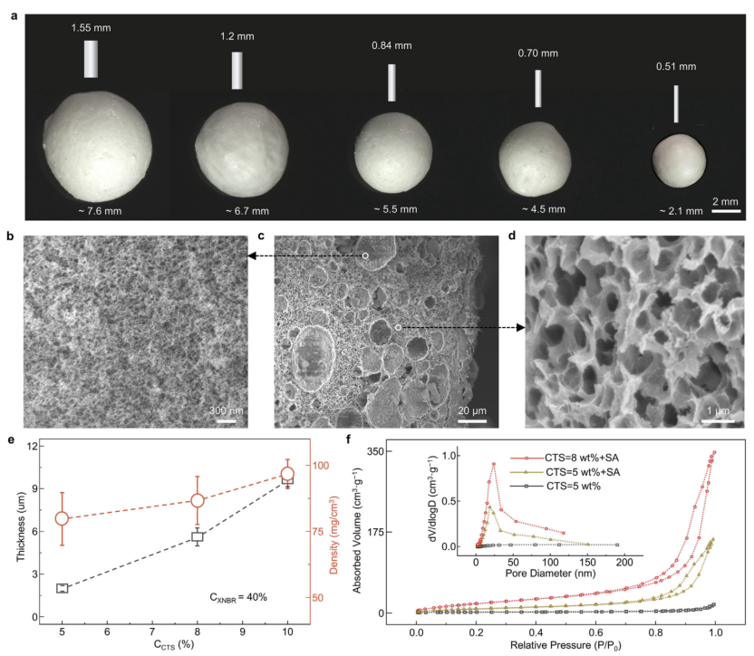 图3 | SAACs的结构 (a) 不同尺寸SAACs的体视显微镜图像(由8 wt% CTS制备的CTS/SA slurry和40 wt% XNBR组装而成),尺寸通过针头直径控制。 (b-d) 嵌入SA的SEM横截面图像(b),展示壳层和核心的单个SAACs(c),以及CTS骨架(d)。 (e) SAACs的壳层厚度和密度与CTS浓度的关系。 (f) 77 K下的氮气吸附等温线,插图为BJH分析的孔径分布。