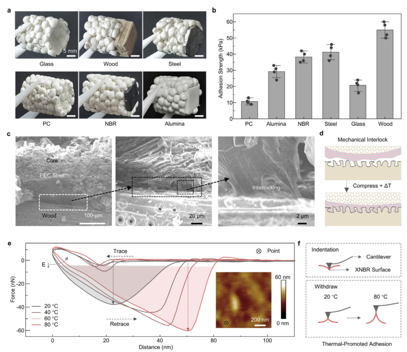 SAACs还表现出优异的互粘附性能,可与PC、Al₂O₃、NBR、不锈钢、玻璃和木材等多种基材形成可靠界面粘接。剪切测试显示,SAACs对木材的粘附强度最高(36.7±5.2 kPa),对PC最低(6.8±3.1 kPa)。在70-80°C热风枪加热处理下,SAACs可在不规则三维表面形成牢固涂层,能耐受机械敲击,适用于非平面表面的现场应用。相比ETPU需要145-150°C的模压温度,SAACs仅需70-80°C,更加节能高效。
