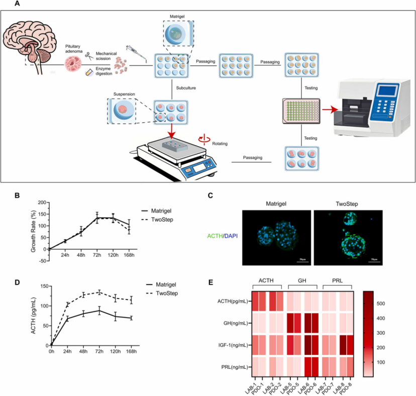 模型优势:采用“两步法” 培养(Matrigel 初培 + 悬浮传代),ACTH 分泌能力更强,稳定传代且保留原肿瘤组织学特征(腺管样结构、CAM5.2/CD44/Ki67 阳性)(图 1-2)。