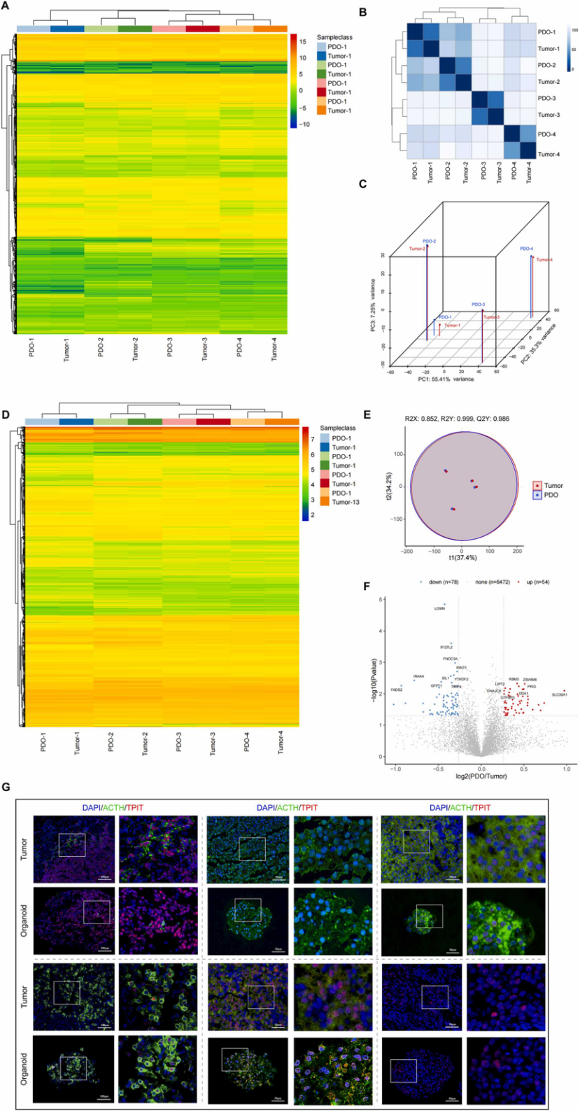 分子一致性:多组学验证显示,PDO 与原肿瘤组织在转录组(图 3A-C)和蛋白质组(图 3D-F)水平高度同源,且能反映患者个体差异(如 TPIT/ACTH 表达异质性)(图 3G)。