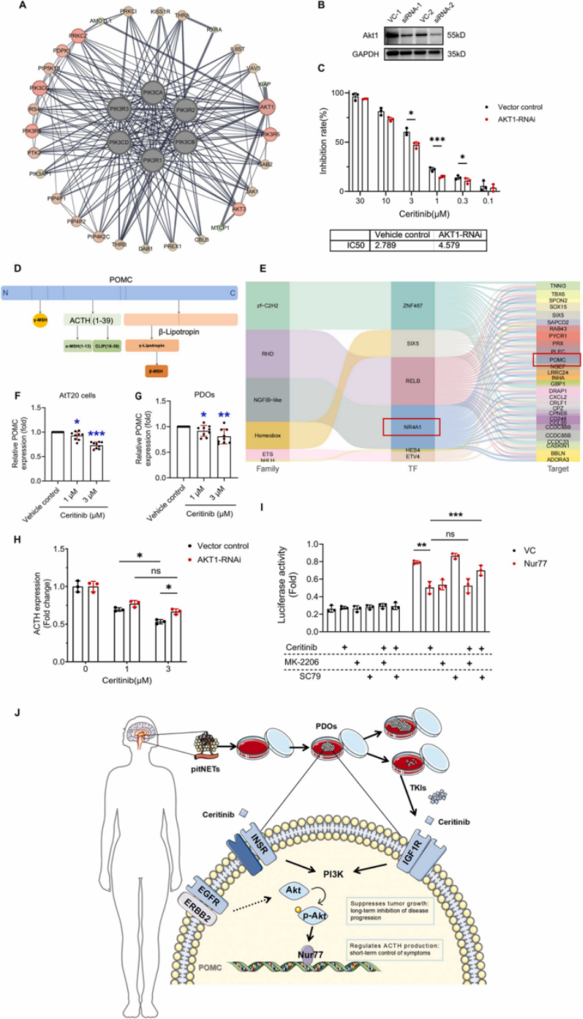 下游调控:Ceritinib 通过抑制 Akt1 活性,降低转录因子 Nur77 的转录活性(图 7I),进而抑制 POMC(ACTH 前体)转录(图 7F-G),最终减少 ACTH 生成(图 7J)。