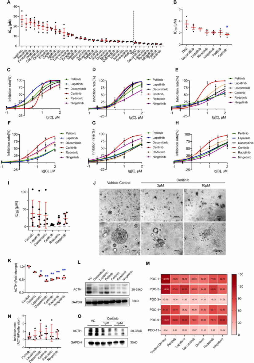 药物筛选:33 种 TKIs 中,6 种(含 Ceritinib)在 AtT20 细胞中 IC50 低于替莫唑胺(TMZ),进一步在 PDO 中验证,Ceritinib 抑制效果最稳定、 potency 最强(平均 IC50 最优)(图 4I)。