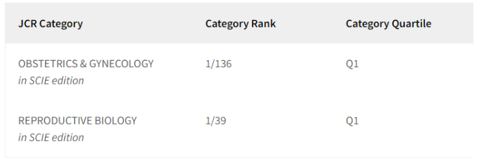 JCR分区:在OBSTETRICS & GYNECOLOGY排第1名,位于Q1区;在REPRODUCTIVE BIOLOGY排第1名,位于Q1区。