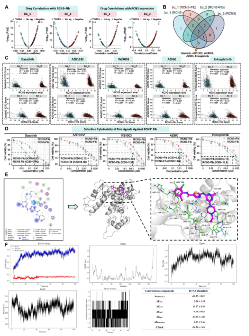 筛选结果:通过药物敏感性预测和体外验证,dasatinib 对 RCN3⁺CAFs 的选择性杀伤作用最强,IC₅₀显著低于 RCN3⁻CAFs(图 9D)。