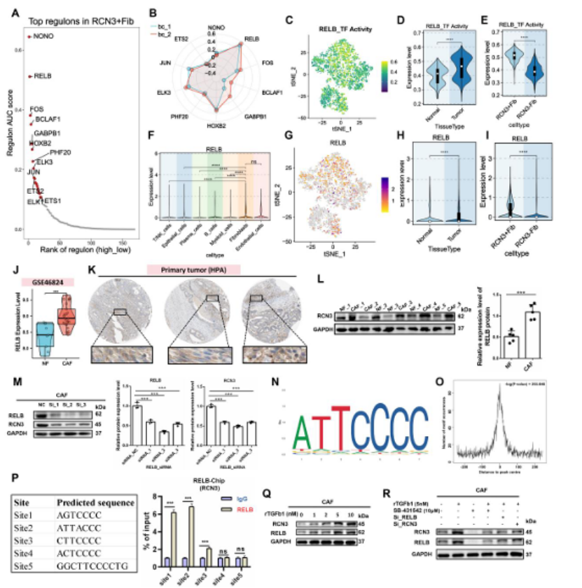 正反馈环路:TGF-β1 通过激活 RELB,促进 RCN3 表达;而 RCN3 又会增强 TGF-β 通路活性,形成 “TGF-β→RELB→RCN3→TGF-β” 正反馈,持续维持 RCN3⁺CAFs 的促癌功能(图 8Q-R)。