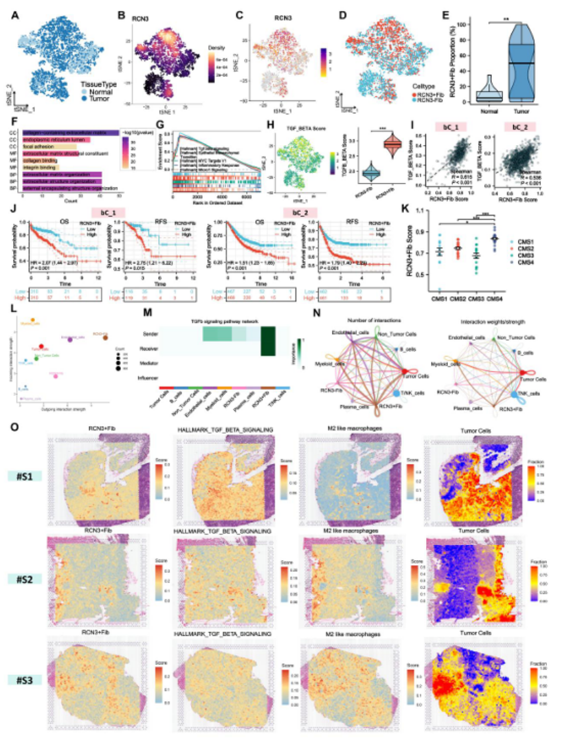 亚型特征:RCN3⁺CAFs 具有高 TGF-β 活性,富集胶原重塑、整合素结合等功能,在肿瘤组织中占比显著高于正常组织,且与 CMS4(间质富集型)亚型高度相关(图 6A-K)。